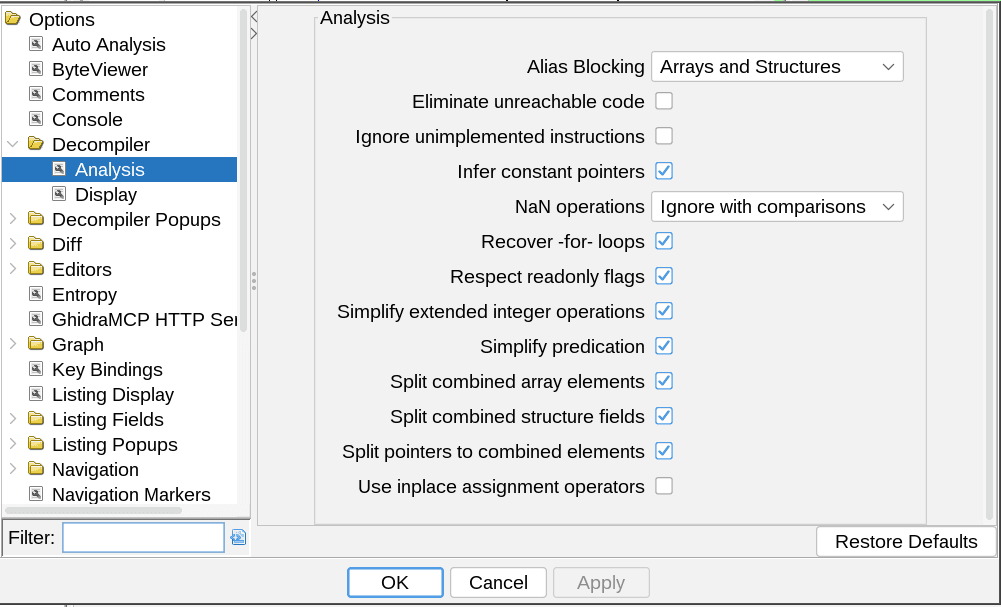 With that small mystery solved, I obtained the same decompilation as Cory, but we still didn't know why Ghidra had simplified away the condition. This task was made a lot more challenging since it was an ARM executable, and neither of us are very familiar with ARM assembly code. Cory eventually figured out that on the same decompiler settings tab, changing the "Alias Blocking" option from "Arrays and Structures" to "None" caused Ghidra to preserve the original condition.